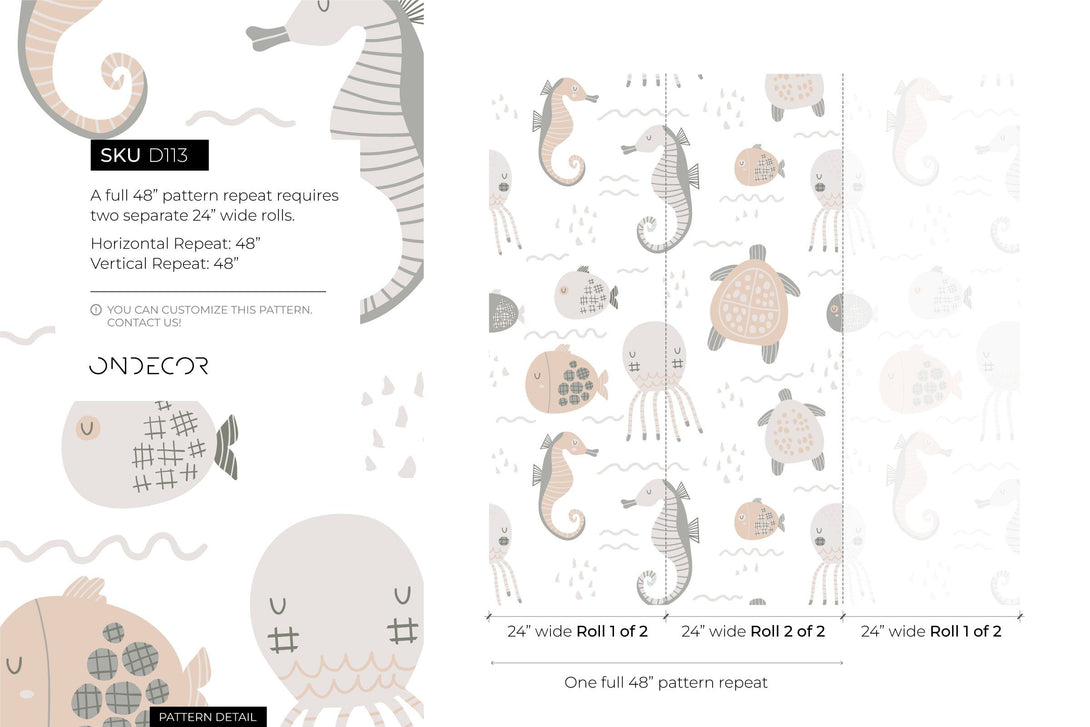 Introduce a serene underwater world into your home with our Animal Wallpaper, featuring a charming collection of sea creatures. This delightful wall art showcases friendly turtles, seahorses, and octopuses rendered in a soft, neutral palette of gray and pink. Perfect for creating a calming and imaginative atmosphere, this wallpaper is an ideal choice for nursery decor, a child's bedroom, or a playful bathroom. The gentle design and soothing colors make it a versatile addition to your interior design, transforming any room into a sweet and tranquil haven.