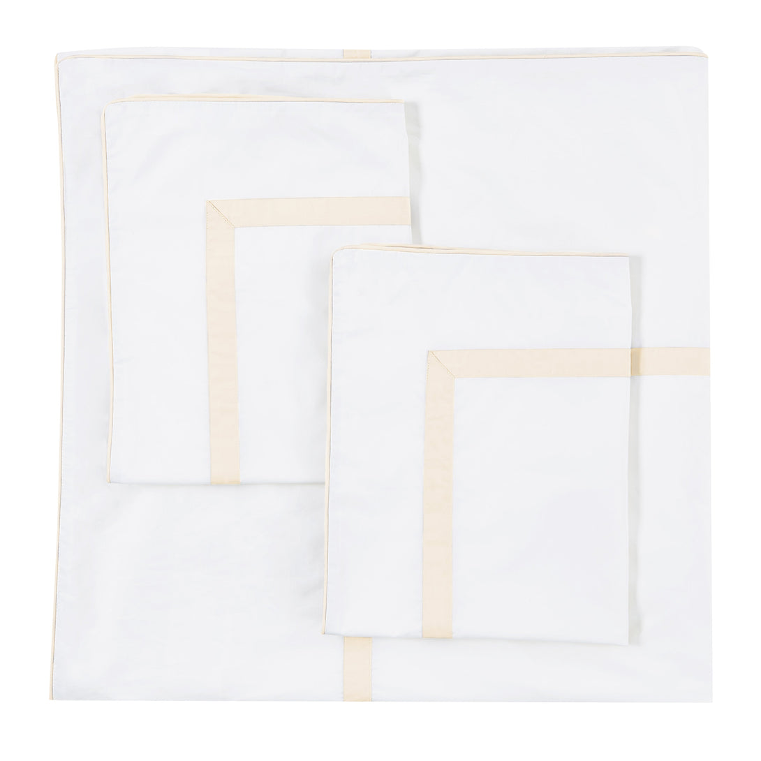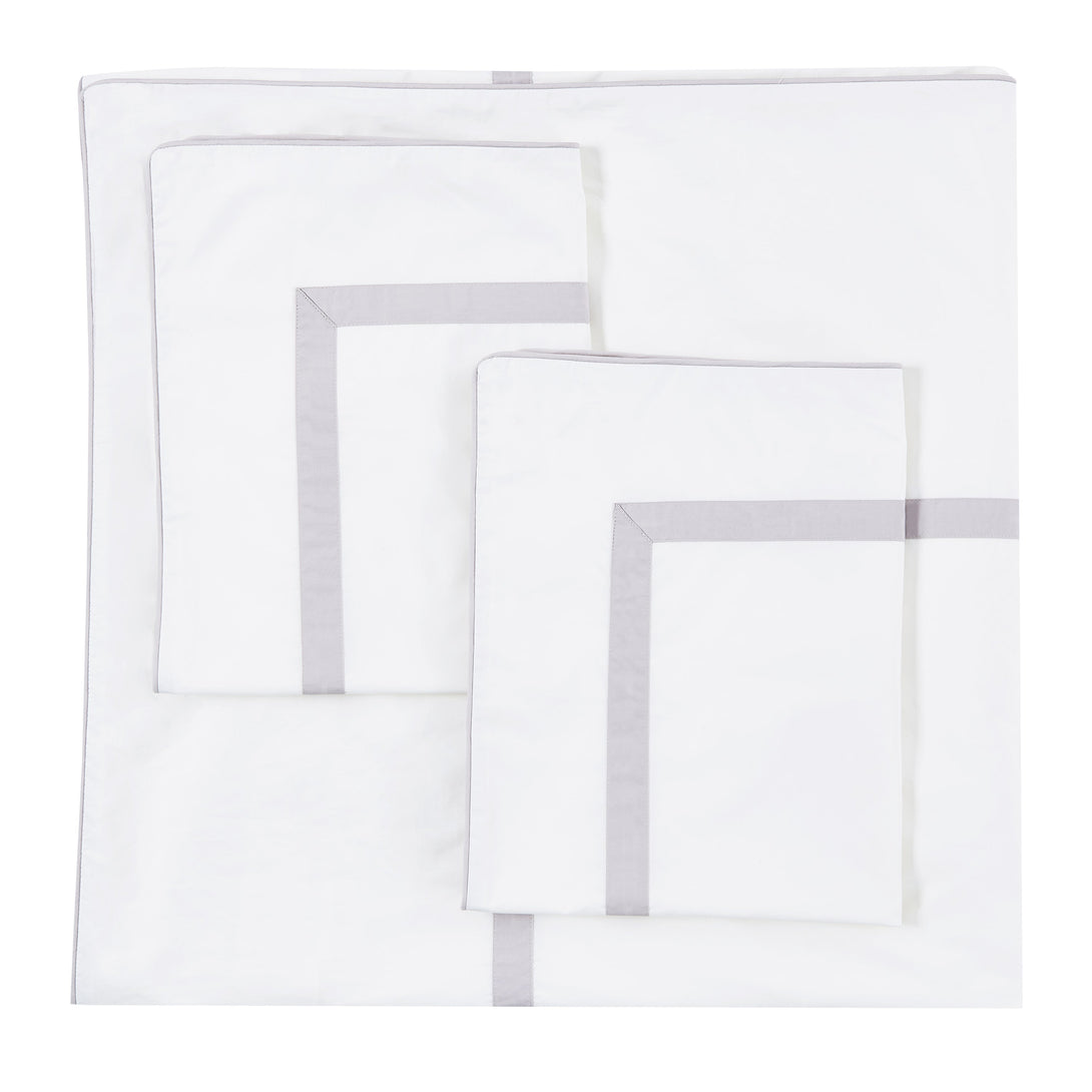 We weave our Percale sheets by laying one warp thread over one weft thread in a one-to-one ratio. This produces a duvet cover with a matte finish that is soft yet durable, crisp and cool to the touch. We added a tailored band and piping to the edge for sophisticated luxury and style.