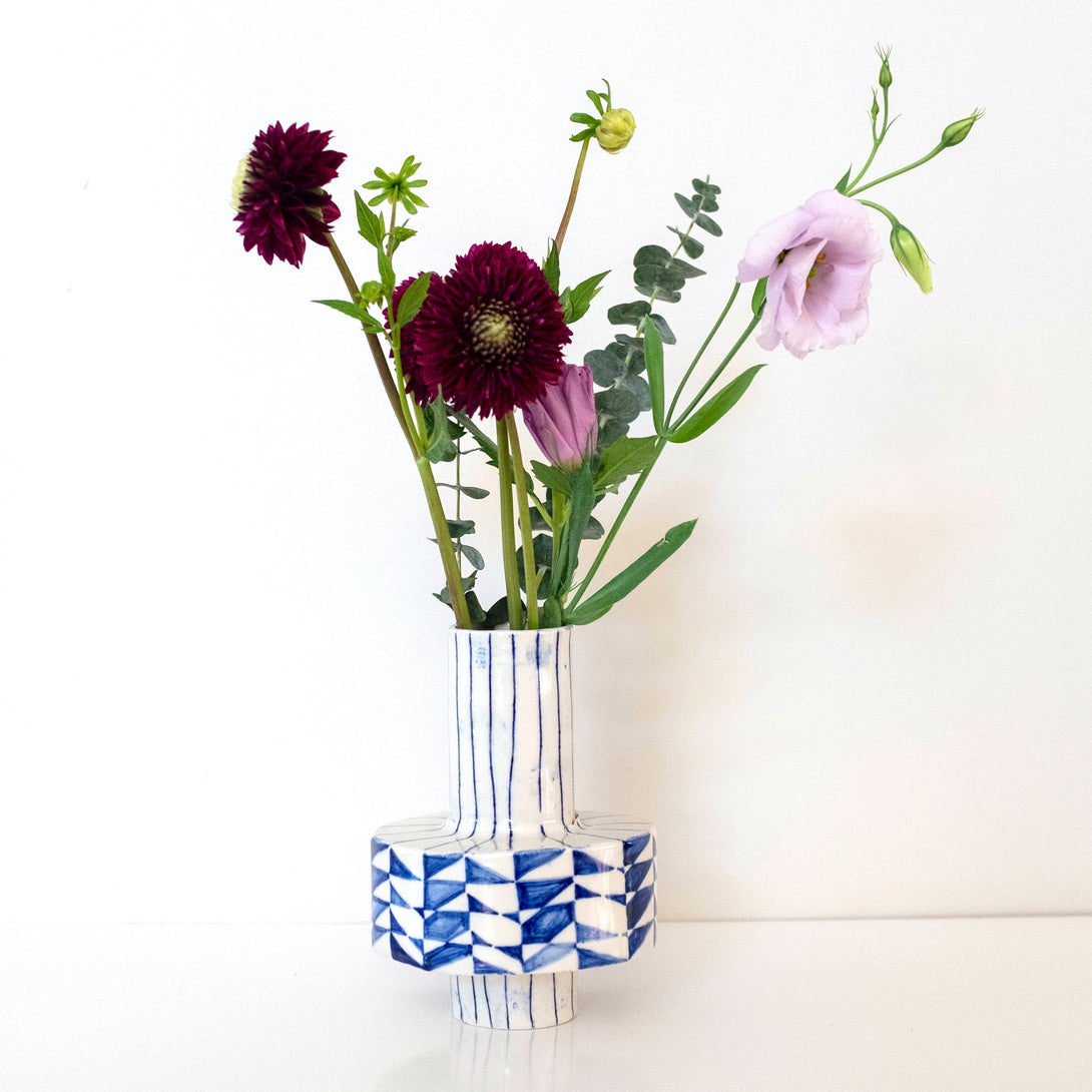 It's a vase, it's a piece of art, it's modern and yet not. Hand-made and painted. Perfect when you need a little something special on your shelf or for a small bouquet of flowers from the farmers market.