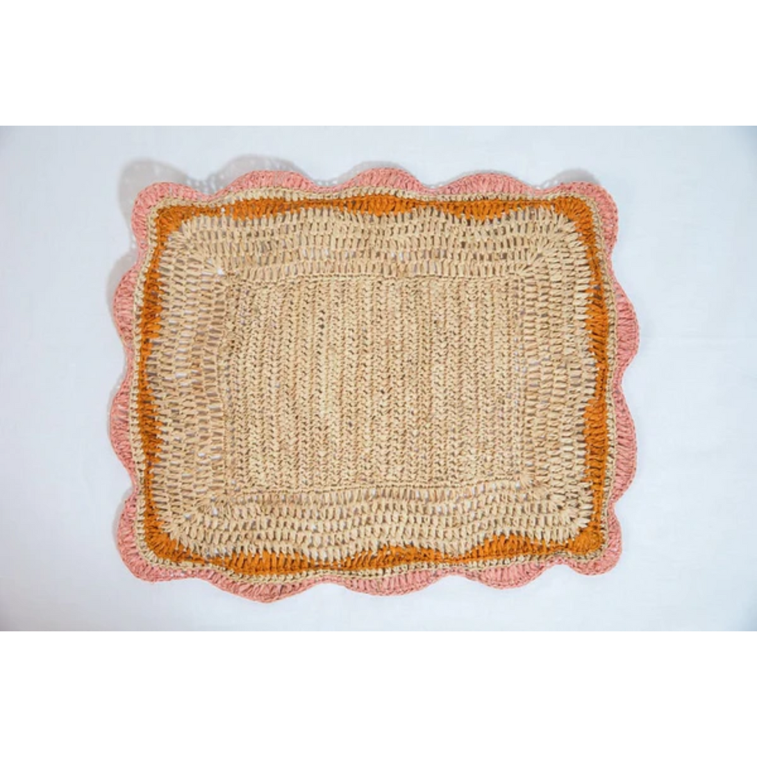 Crafted from natural raffia fiber, these creative placemats are handmade by skilled artisans, ensuring that each one is unique and of the highest quality. The beautiful multicolor pattern is woven into the placemat with intricate detail, and the orange and pink edges add a touch of elegance and sophistication.